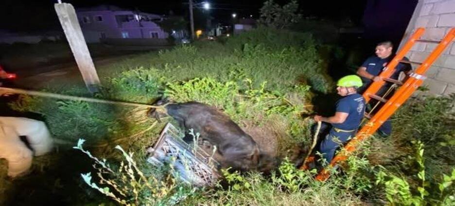 Ante esa situación, y con ayuda de un vecino, procedieron a realizar maniobras, logrando poner a salvo al becerro.